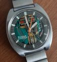 Bulova started offering more models towards the mid 1960s. Pictured here is the only gold filled USA model offered, case style 2531. It came in two model designations, the Spaceview "H" and "I" depending on the band. This model used a reflector ring to mark minutes/seconds, this model also used longer white luminous "Spear" hands.