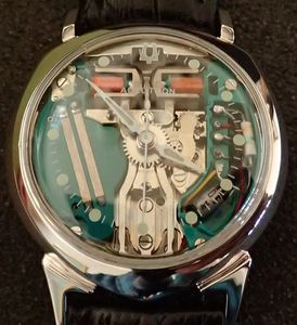 One of the earliest factory spaceviews is known as the Spaceview "B", the only early stainless model. These started production in 1962 and used a yellow dotted crystal and yellow lance hour/minute hands with a "fils" style yellow sweep. Based on case style 2362 (Photo courtesy of Chris Akin) . A similar variant called the spaceview "C" was also produced using this case but used white luminous lance hands and a luminous dotted crystal.